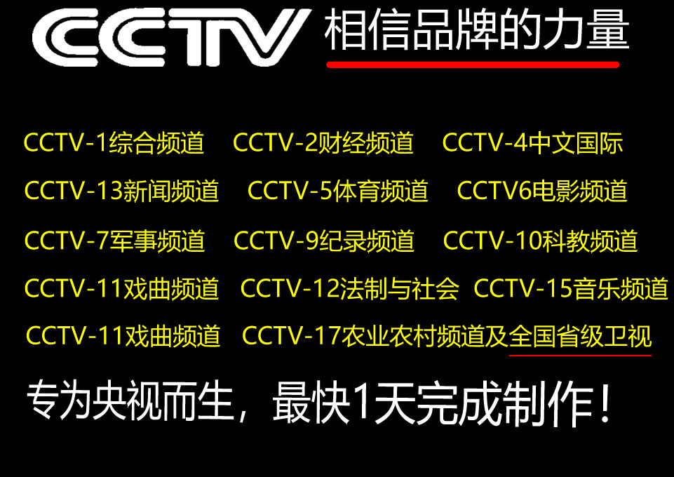 携手中央电视台,践行品牌强国计划,推动相信品牌的力量,对央视广告行业近十年的深耕,全面灵活掌握中央电视台对广告内容严格的审查标准以及特殊要求,适用于各类行业!